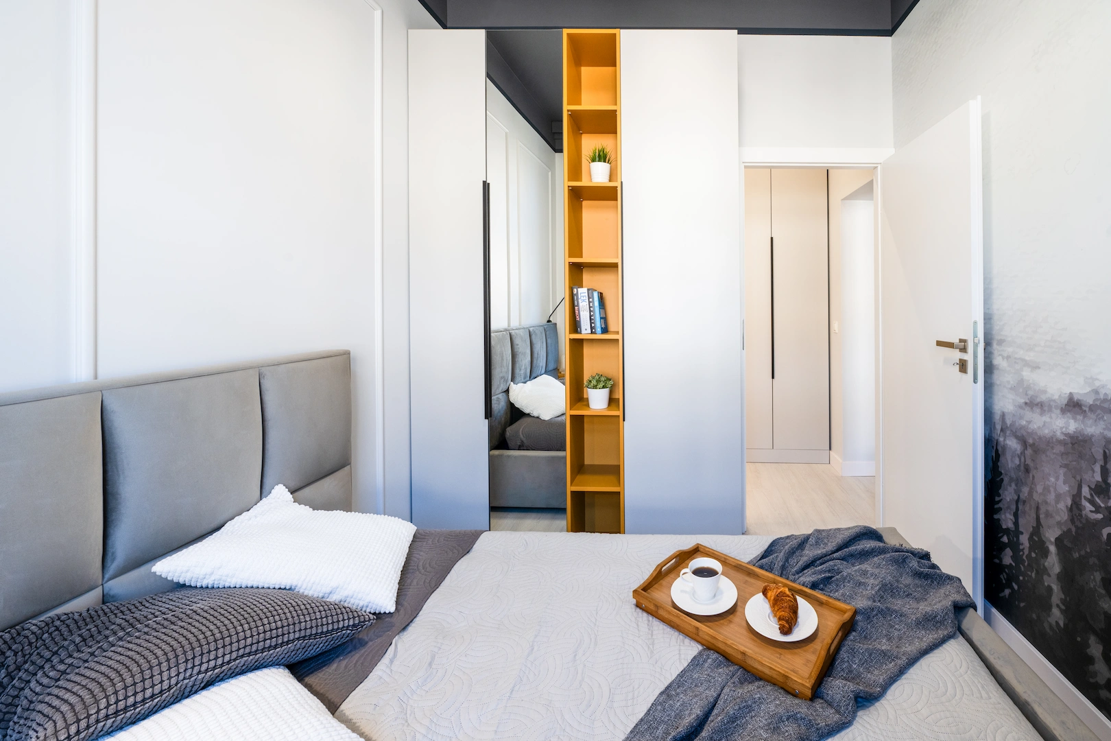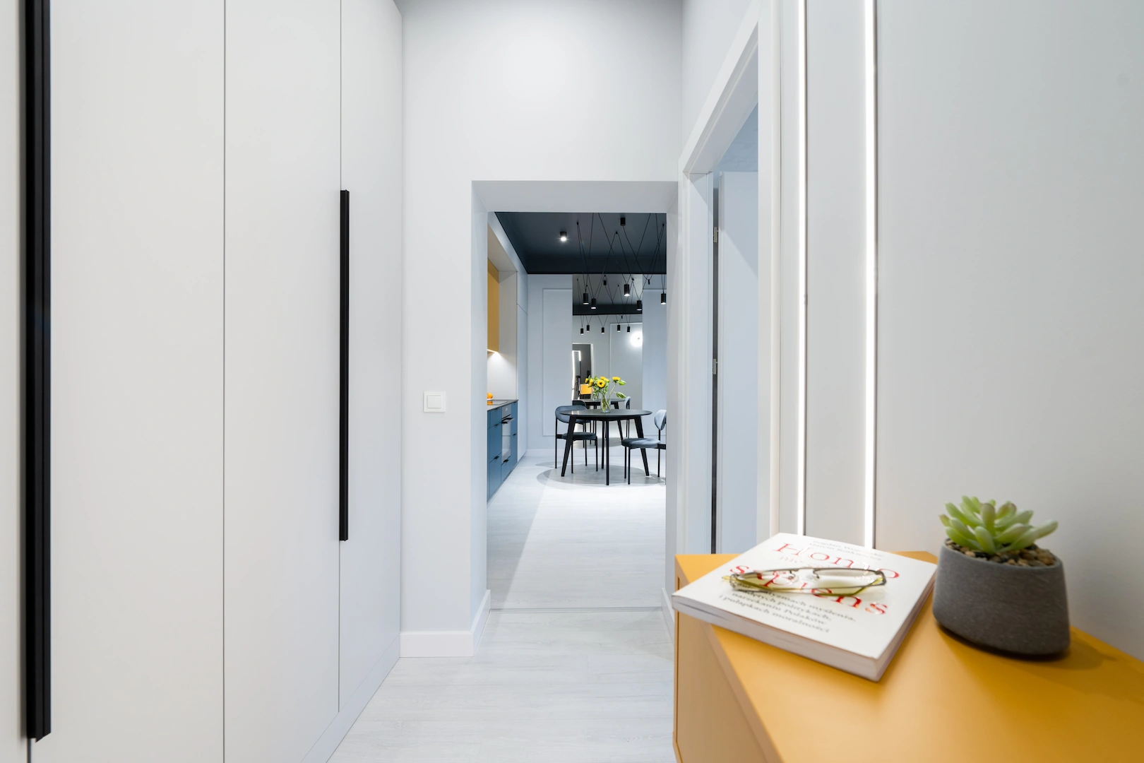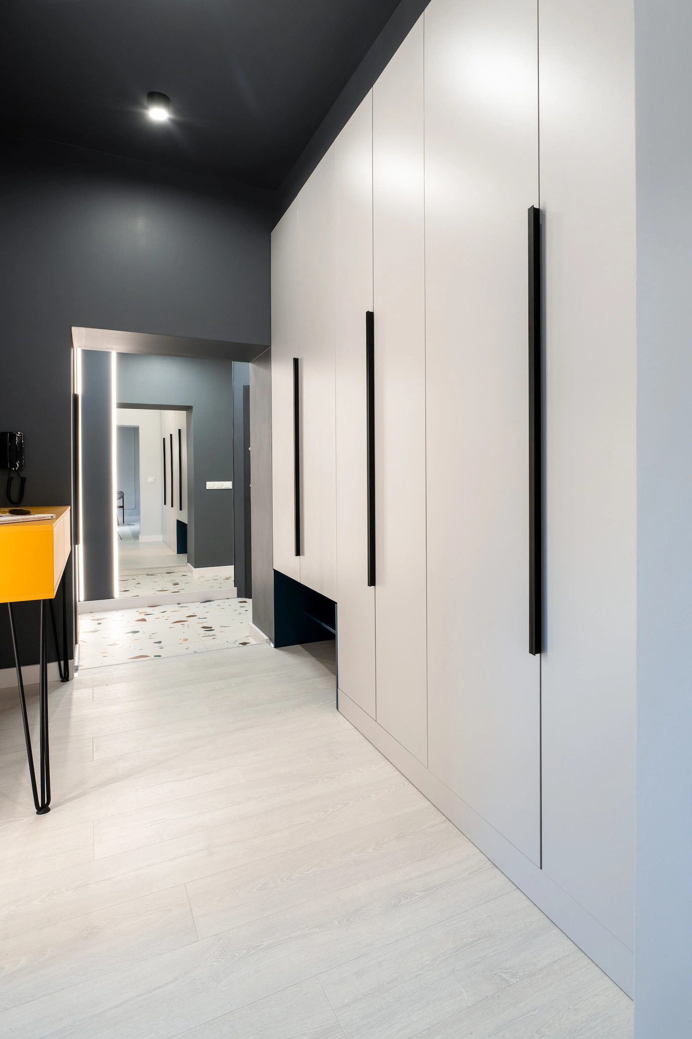 W całym mieszkaniu zostanie wykonana zabudowa stolarska na wymiar, co umożliwi optymalne wykorzystanie przestrzeni i nadanie wnętrzom spójnego, eleganckiego wyglądu.