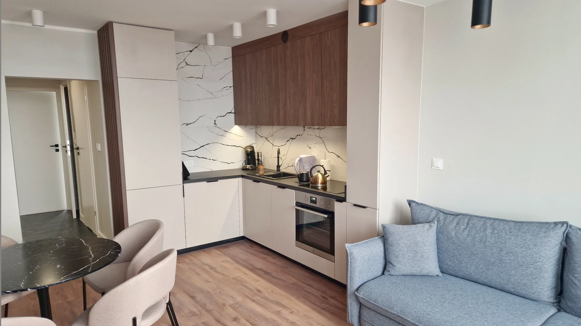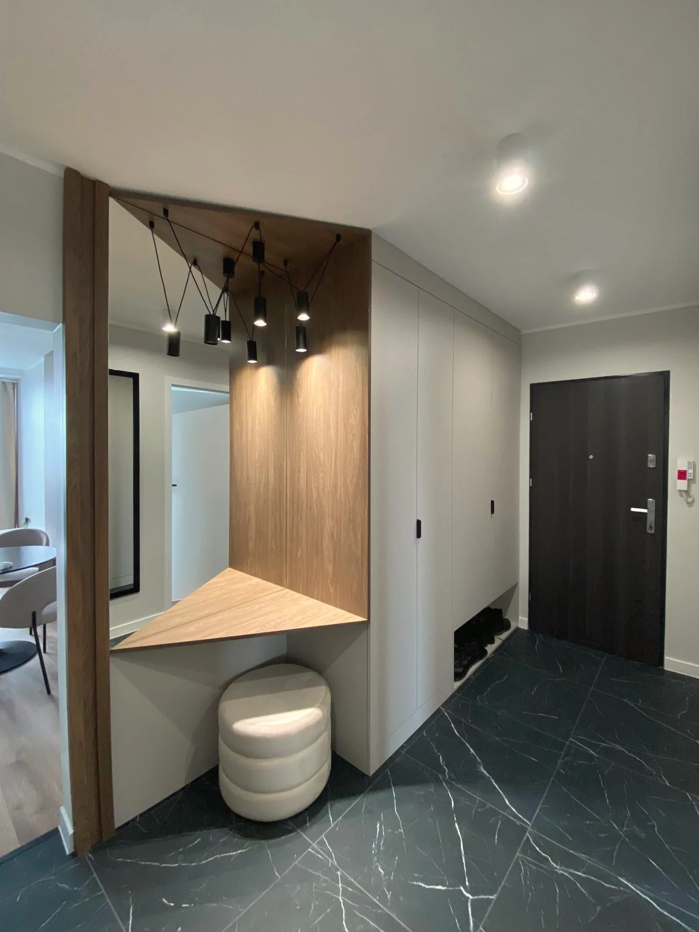 Zrealizowano zabudowę na wymiar w salonie z kuchnią, łazience i przedpokoju, co pozwoliło na optymalne wykorzystanie przestrzeni oraz nadanie wnętrzom eleganckiego wyglądu.